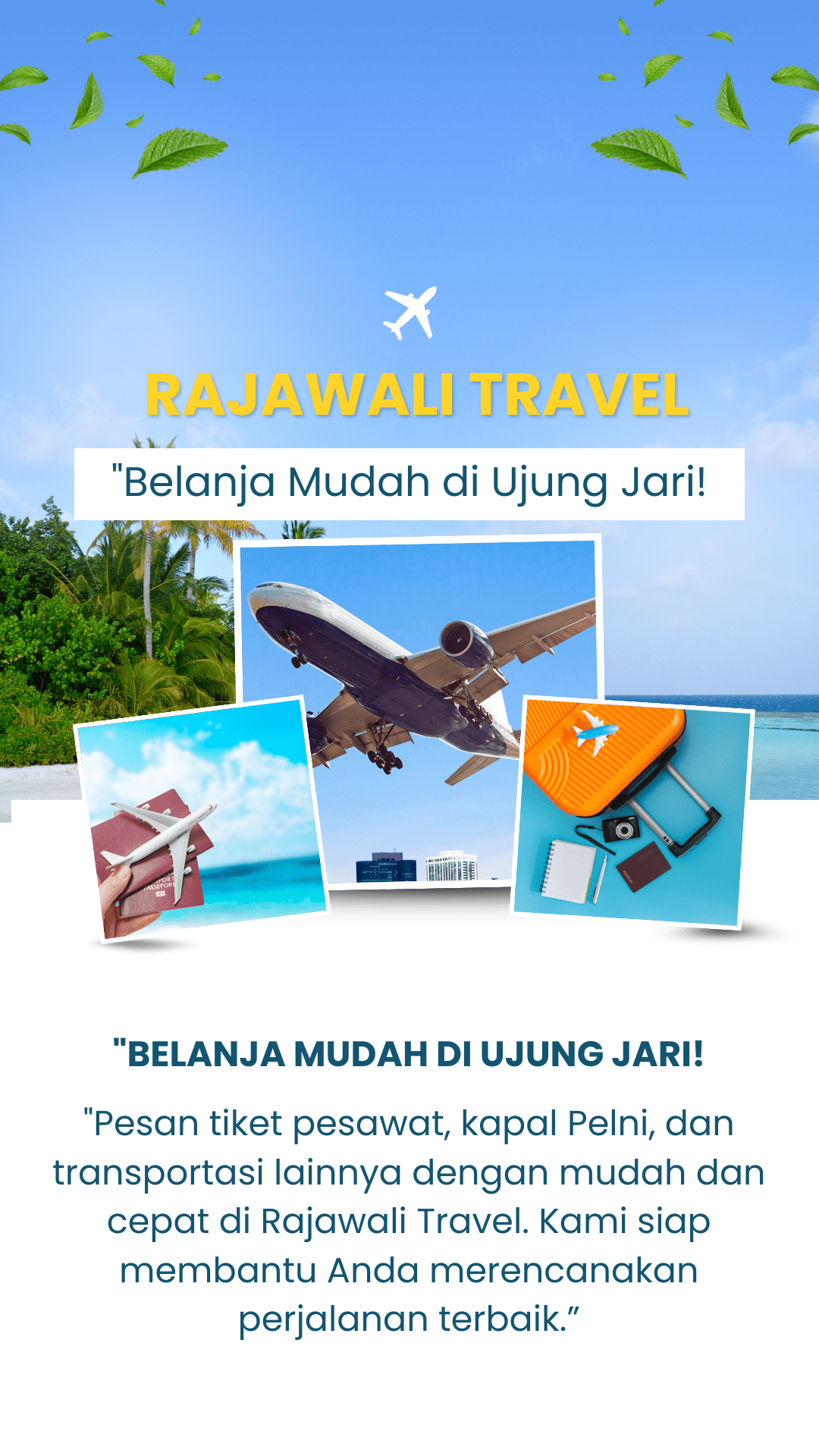 Pesan tiket pesawat, kapal Pelni, dan transportasi lainnya dengan mudah dan cepat di Rajawali Travel. Kami siap membantu Anda merencanakan perjalanan terbaik.